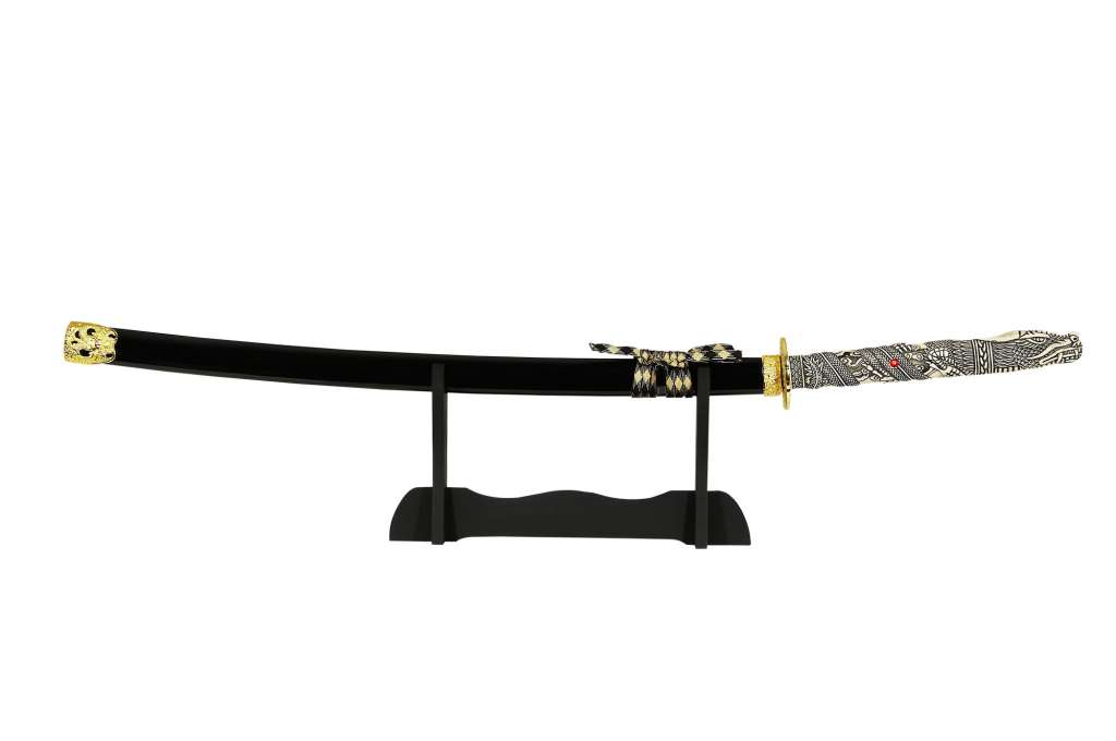 Предлагаемая вам копия выполнена достоверно и с большим тщанием. Рукоять вполне достоверно имитирует слоновую кость и выглядит один в один, как в сериале. А на стальном клинке катаны даже имеется имитация линии закалки – хамон! Несомненно, эти детали придают мечу достоверности. Она выглядит, как лёгкий и богато декорированный меч приодворного эпохи Эдо, времени когда японские мечи достигли максимальной роскоши в своём облике. Кстати, время создания меча, согласно лору сериала, вполне укладывается в этот период.