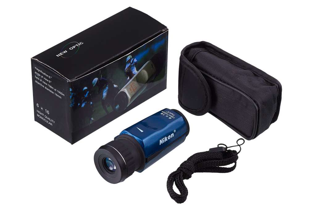 В комплект поставки монокуляра Nikon 6X16 входят: чехол для транспортировки, шейный шнурок, салфетка для протирки линз и, непосредственно, сам прибор.
