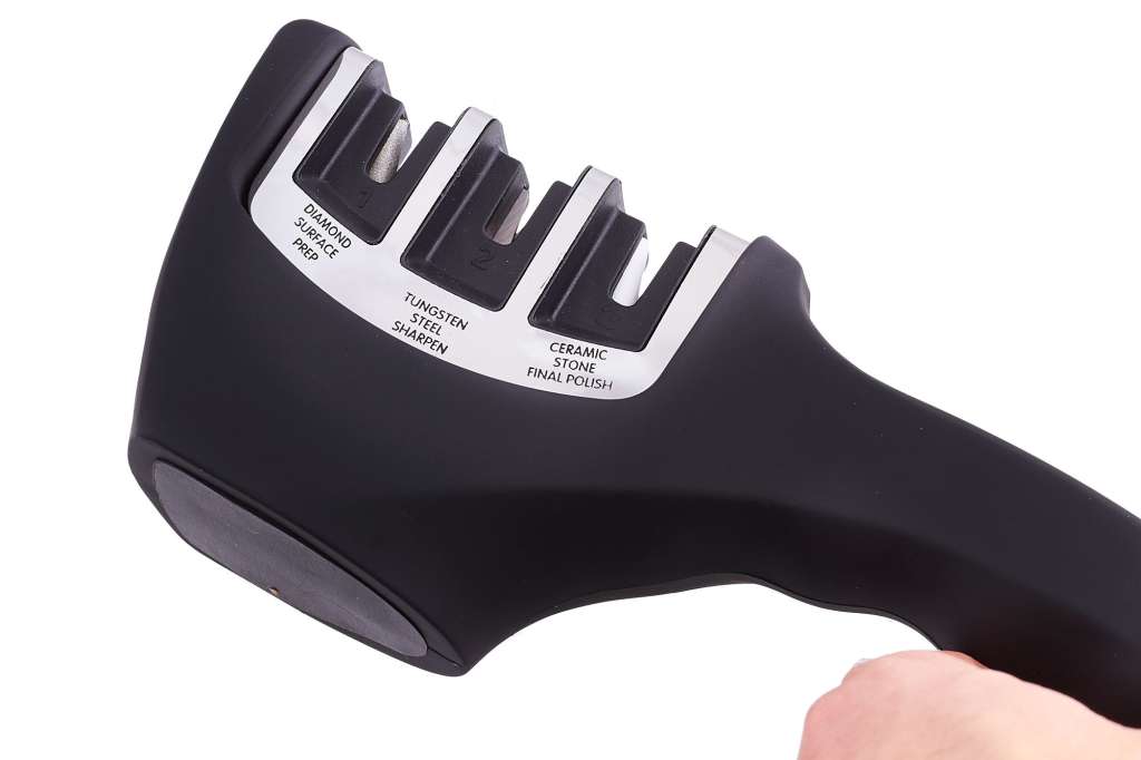 Конструкция точилки RM 008 позволяет проводить полный цикл заточки даже совсем тупого ножа. Потому что в ней имеется три отделения с разными абразивами: