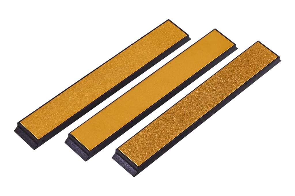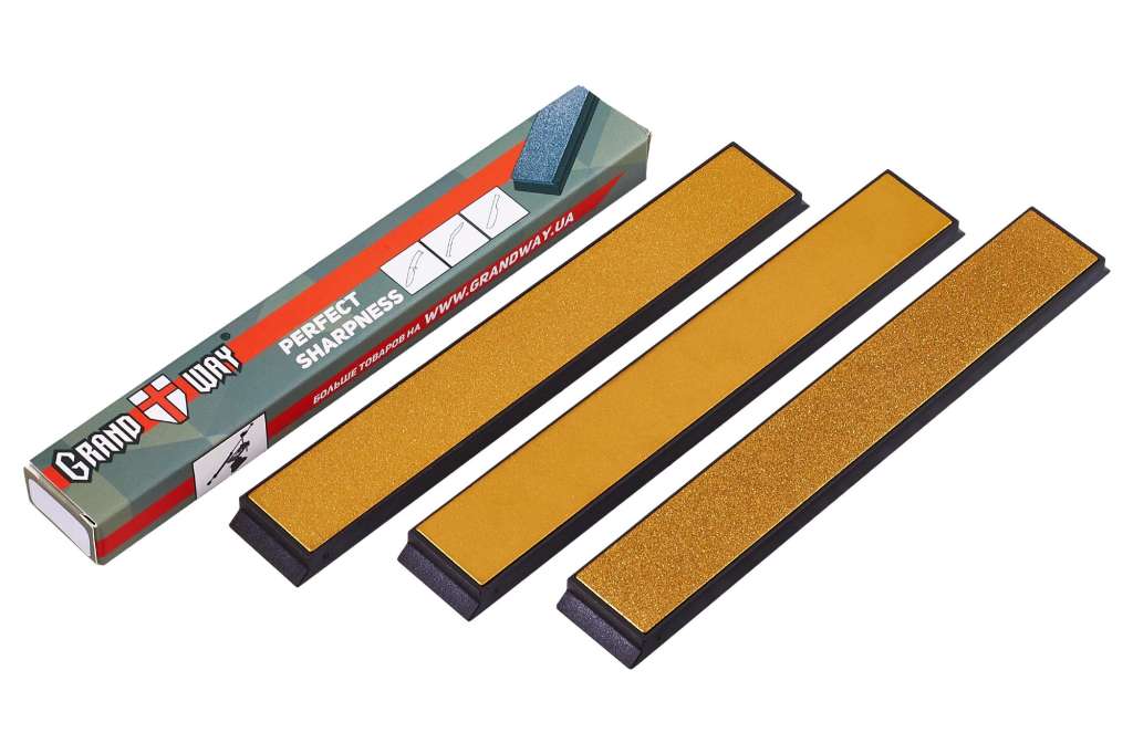 Набор алмазных точильных брусков для заточки. Подходит для заточных устройств типа «Апекс» и для ручной заточки. Состоит из трех брусков с размерами 150х20 и зернистостью 240, 600, 1000. Заточку рекомендуется осуществлять плавными возвратно-поступательными движениями, стараясь охватить наибольшую поверхность, переходя от грубого к более тонкому брусочку.