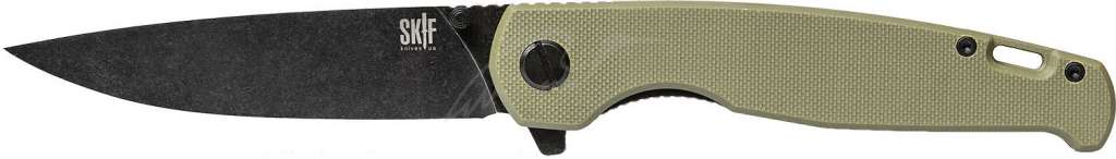 Прямые спуски от обуха обеспечивают ножу отличные режущие качества. Для защиты клинка от царапин используется покрытие Stone Wash, причем в двух вариациях: черного или белого цвета (в зависимости от модификации). Открывание ножа осуществляется при помощи флиппера и двухстороннего шпенька. Извлечение клинка очень плавное, что было достигнуто благодаря применению системы шарикоподшипников - одного из главных отличий нового поколения ножей Skif. Для фиксации клинка выбран один из наиболее надежных замков - Frame-Lock.