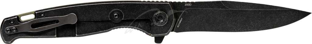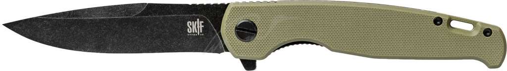 Прямые спуски от обуха обеспечивают ножу отличные режущие качества. Для защиты клинка от царапин используется покрытие Stone Wash, причем в двух вариациях: черного или белого цвета (в зависимости от модификации). Открывание ножа осуществляется при помощи флиппера. Извлечение очень плавное - это было достигнуто благодаря применению системы шарикоподшипников - одного из главных отличий нового поколения ножей Skif. Для фиксации клинка выбран один из наиболее надежных замков - Frame-Lock.