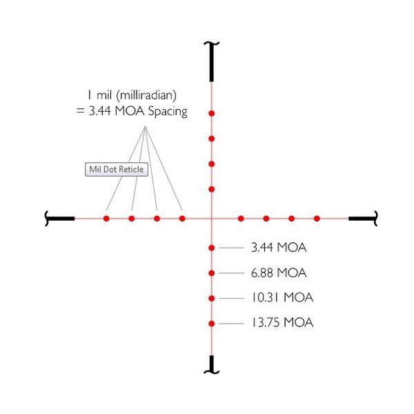 Mil Dot - одна из самых универсальных прицельных сеток, все компоненты этой сетки имеют строго регламентированные размеры, расстояния между всеми элементами также регламентированы. Благодаря этому не проблема определить расстояние до цели, приняв при этом правильную поправку на ветер и определить траекторию полета и падения пули. Данный Mil Dot верен при 10-кратном увеличении. Для других увеличений линейные и угловые размеры определяются методом интерполяции, либо по специальным таблицам. Персональную адаптацию сетки под конкретное оружие и тип снаряда позволит совершить бесплатный баллистический калькулятор.