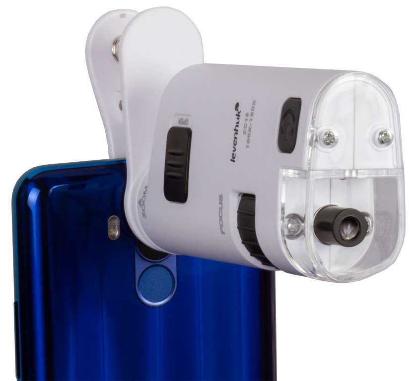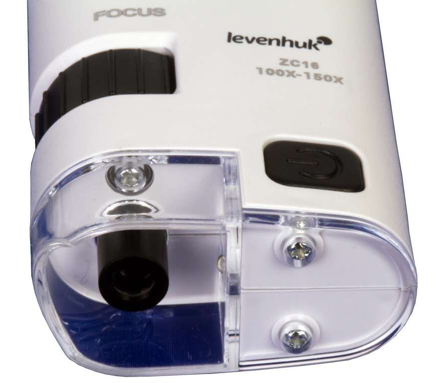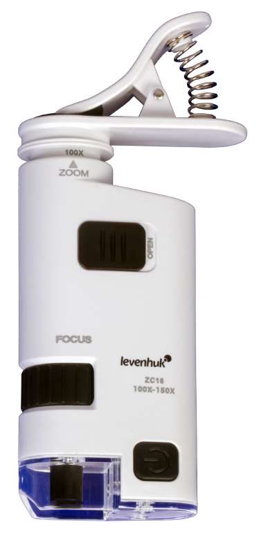Модель Levenhuk Zeno Cash ZC16 снабжена зажимом для установки на мобильные устройства. Это позволяет использовать камеру смартфона или планшета для фото- и видеосъемки с увеличением. Картинка выводится прямо на экран телефона. Для работы при недостаточном освещении в конструкции микроскопа предусмотрена подсветка – яркий светодиод. Для его работы требуются батарейки (не входят в комплект). Для настройки резкости используется барабан грубой фокусировки.