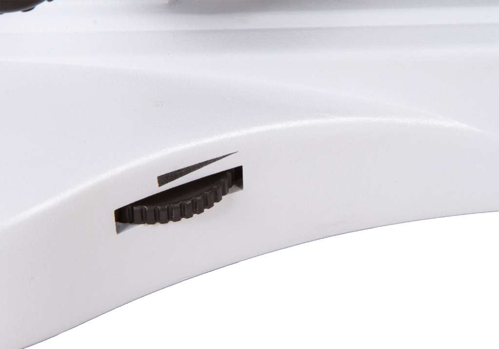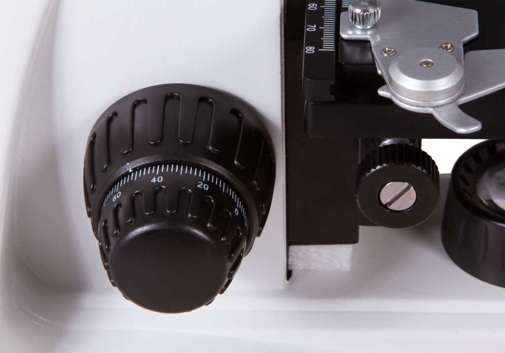 Под револьверным устройством находится механический столик с препаратоводителем. Столик можно перемещать по двум направлениям. Яркая светодиодная подсветка находится в нижней части микроскопа. В систему освещения также входит конденсор Аббе с ирисовой диафрагмой. Есть держатель фильтра. Доступны точная и грубая фокусировки.