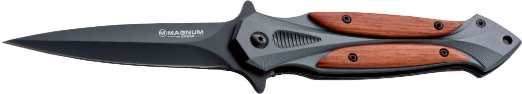 Складной нож Boker Magnum Starfighter выполнен в виде кинжала с обычной режущей кромкой. Клинок из нержавеющей стали 440 имеет черное антикоррозийное покрытие и прекрасно гармонирует с деревянными накладками рукояти. Нож приводится в рабочее положение при помощи флиппера, который также исполняет роль гарды и предотвращает соскальзывание пальцев руки на клинок. Оснащен удобной клипсой и отверстием для крепления темляка.