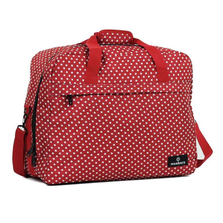 Коллекция багажных сумок Essential On-Board разработана в соответствии с ограничениями по провозу ручной клади, выдвигаемыми наиболее популярными авиакомпаниями, предоставляющими бюджетные перевозки (МАУ, WindRose, UTair и др.). Компания Members позаботилась, чтоб все необходимые и наиболее ценные вещи всегда находились с Вами во время полета. Members Essential On-Board Travel Bag 40 Red Polka - классическая дорожная сумка для транспортировки необходимых вещей в руках, на плече или на телескопической ручке основного багажа. Преимущество данной модели в том, что ее внешние размеры точно соответствуют лимитам, предъявляемым популярными бюджетными авиакомпаниями к провозу основной ручной клади на борту авиалайнера, а внутреннее пространство при этом позволяет вместить немалое количество вещей. При этом простой дизайн способствует удобству использования этой модели, как универсальной сумки на каждый день.