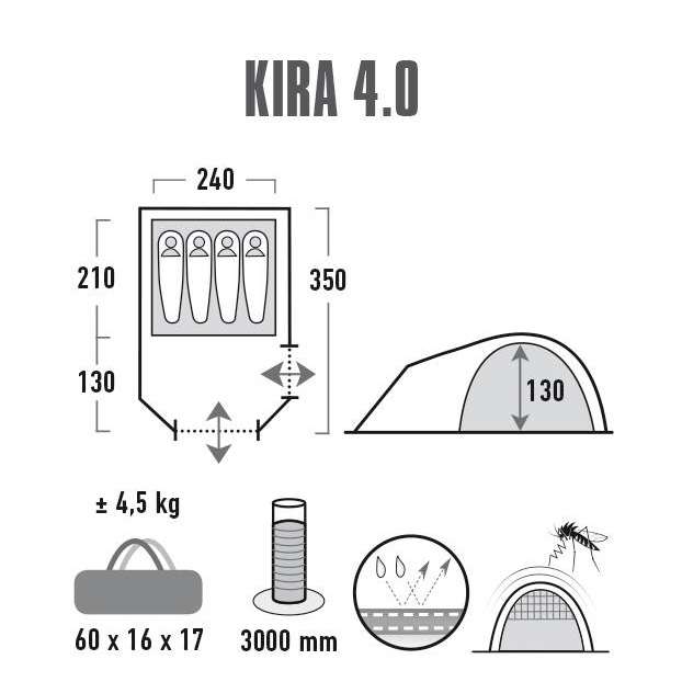 Обновленная модель популярной палатки High Peak Kira 4.0 станет надежным спутником в ваших путешествиях. Использование новых высококачественных материалов позволило повысить степень защиты отдыхающего от вредоносного воздействия ультрафиолетовых лучей в соответствии с стандартом - UV STANDARD 801. Внутренняя часть тента имеет специальное алюминизированное покрытие, которое обеспечивает дополнительную термоизоляцию. Эффективная система вентиляции VARIO VENT CONTROL на входе во внутреннюю палатку, обеспечивает комфортный микроклимат при любых погодных условиях. Затемненная спальня дает возможность отдохнуть не только ночью, но и в дневное время суток. Просторный тамбур на два входа позволяет легко разместить туристический инвентарь или организовать кемпинговую кухню. Антимоскитная сетка на входе в спальную комнату. Модель High Peak Kira 4.0 станет хорошим выбором для использования как в базовом лагере, так и для семейного отдыха на природе.