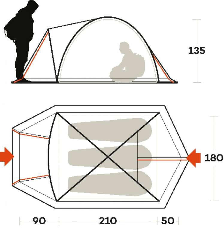 Оба входа в палатку оснащены москитной сеткой. Один из входов может быть открыт наполовину, выполняя роль окна