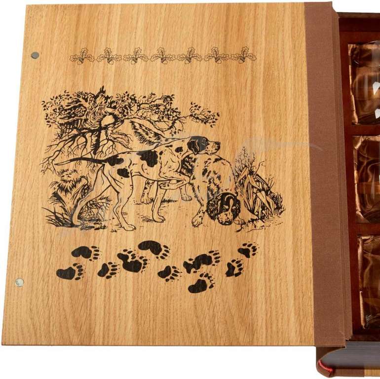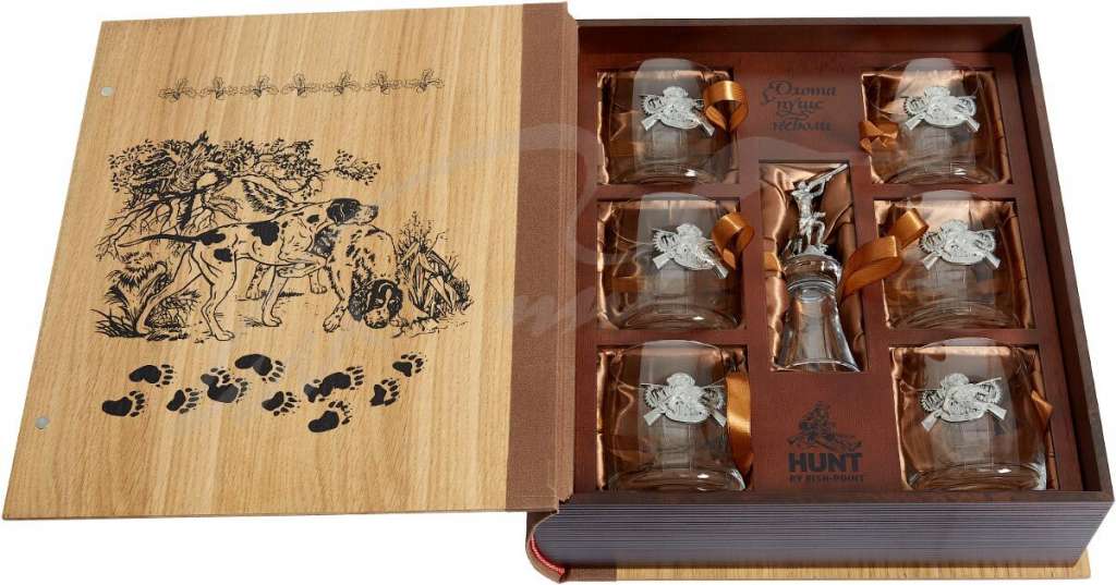 Прекрасный способ порадовать человека, увлеченного охотой – подарить подарочный набор Fish Point «Охота Пуще Неволи». Стилизованный под старинную книгу, набор имеет тенденцию даже стать фамильным наследием, а вечерние посиделки в кругу семьи и друзей с рассказами об охотничьих подвигах заиграют новыми красками. Каждая деталь выполнялась вручную. Шкатулка изготовлена из натурального дуба. Крышка и форзац украшены тематической картиной с легавыми. Внутри каркас для стаканов выполнен из дерева и обрамлен шелковой тканью. Для каждого стакана есть свое отделение с язычком для легкого извлечения. Набор «Охота Пуще Неволи» укомплектован 6-ю стаканами для виски по 290 мл. Сами стаканы выполнены из стекла и на каждом красуется накладка из пищевого олова. Седьмая рюмка, украшенная фигуркой охотника во время охоты, - штрафная для тех, кто опоздал. Ее нельзя поставить, только до дна!Характеристики
