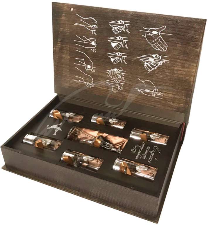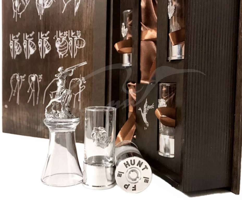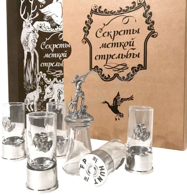 Коллекционное издание "Секреты Меткой Стрельбы" – станет особенным подарком для особенного человека. Идеально подойдет для холодных зимних вечеров у камина за душевными разговорами и охотничьими байками. Книга-шкатулка изготовлена вручную из натурального дуба, тонирована и покрыта лаком. Картина на обложке выполнена золотым металликом. На форзаце изображена схема правильного использования лука. Внутри находится изысканный каркас из лакированного дерева и обрамлением из шелковой ткани. У каждого прибора свой отсек и для легкого извлечения предусмотрены язычки. Набор рассчитан на 6 персон. Рюмки, объемом 50 мл, выполнены из стекла в виде патронов, а гильзы из алюминия. Патроны декорированы накладками из олова в виде легавой с дичью. Седьмая рюмка объемом 60 мл – штрафная для тех, кто опоздал. Ее дно декорировано статуэткой с охотником во время охоты, поэтому ее нельзя поставить, только до дна!Характеристики