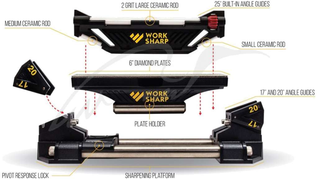 Darex Guided Sharpening System комплектуется 2-мя алмазными пластинами - coarse (320 grit) и fine (600 grit), поворотным керамическим стержнем coarse/fine, малым и средним предустановленными керамическими камнями и направляющей с углами 17° и 20°.