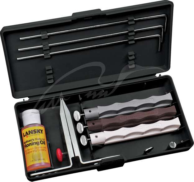Каждый кейс Lansky Sharpening System включает запатентованный зажим для ножа со сменным углом затачивания, точильные камни с рукоятками, цвет которых обозначает зернистость камня, направляющие для каждого точильного камня и специальное масло для камней, позволяющее улучшить результаты затачивания.