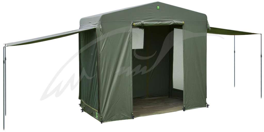 Палатка Rod Hutchinson Cabrio Cookhouse Deluxe – полевая кухня, предназначенная для рыболовов, которые проводят у воды несколько дней подряд и хотят комфортно готовить и принимать пищу на природе. Конструкция позволяет разместить внутри несколько столов с газовой плитой, мобильным холодильником, посудой и всеми необходимыми аксессуарами. Особенностью данной модели является наличие двух входов (сквозная конструкция) и возможность установки двух навесов в передней, задней части или по бокам. Большие окна оснащены москитными сетками, также в комплекте съёмное прозрачное окно для использования в холодную пору года.