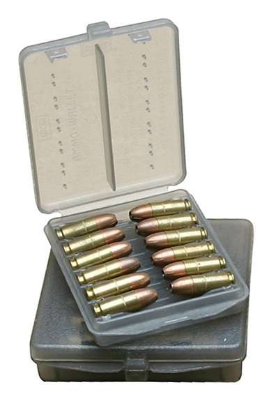 Кейс для пистолетных патронов MTM CASE-GARD Handgun Ammo Wallet предназначен для транспортировки пистолетных патронов. Выглядит и имеет такие же габариты как бумажник и помещается в большинство карманов. В кейсе каждая пуля надежно закреплена и защищена. MTM CASE-GARD Handgun Ammo Wallet вмещает в себя 18 патронов калибром .380 и 9mm. Кейс выполнен из прозрачного пластика с дымчатым оттенком, что дает возможность видеть внутри патроны.