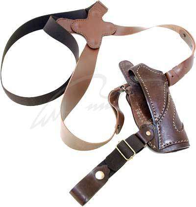Кобура выполнена из натуральной ременной кожи. Плечевая система комбинированная (кожа + эластичная лента). Имеет возможность при отсоединении плечевой системы, использоваться как поясная. Регулировка плечевой системы осуществляется при помощи специальных винтов.