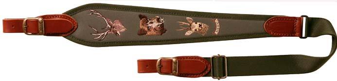 Регулируемый ружейный ремень (погон) из кордуры и кожи. Ремень декорирован вышивкой оленя, кабана и косули. Обратная сторона ремня оснащена специальной мягкой накладкой, которая буквально прилипает к поверхности одежды, обеспечивая надежную фиксацию ружья на плече, предотвращая его сползание.