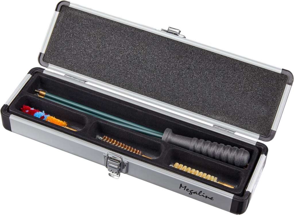 Набор Megaline для чистки огнестрельного оружия калибра 9 мм в алюминиевом кейсе. Особенности: - 1 шомпол. - 1 ерш из нейлона. - 1 латунный ерш.