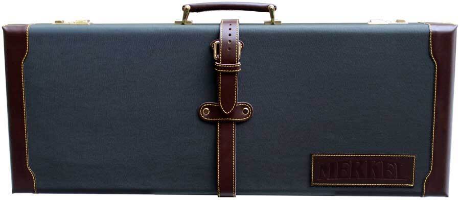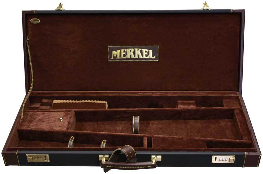 Фирменный кейс Merkel, под комбинированное ружье или штуцер. Оружие укладывается в разобранном виде. Имеется специальный отсек для укладки оптического прицела (на быстросъемном кронштейне), а также отдел для патронов или прочих мелочей. Снаружи обтянут синтетической тканью зеленого цвета и коричневой кожей. Внутри оббит бархатом.