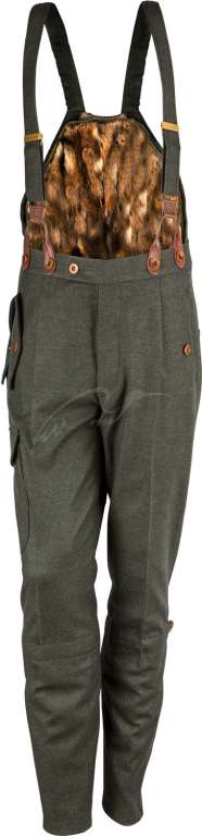 Классический демисезонный полукомбинезон Habsburg Reinhold Wallsee выполнен из 100% шерсти в европейском стиле и однотонной серо-зелёной расцветке. Кожаные петли на регулируемых шлейках подтяжек обеспечат надежную фиксацию за пуговицы. Внутренняя сторона брюк, защищающая поясницу, обшита натуральным мехом горностая.