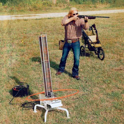 Do-All Outdoors DE2 Double Eagle - автоматическая машинка для запуска мишеней-тарелок в двух плоскостях, на 90 мишеней. Запускает мишени по одной и по две. Возможность установки кольца безопасности. Запуск двух тарелок на 50 метров и одной тарелки на 65 метров. Регулирование угла запуска от 5 до 35 градусов. Педаль запуска.