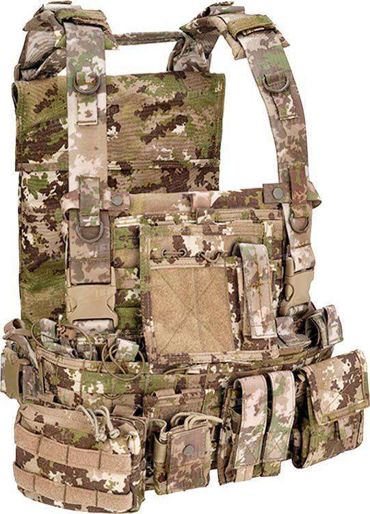 Жилет укомплектован утилитарным, административным подсумком, сумкой для сброса магазина, подсумком под радиостанцию, а так же подсумками под три пистолетных магазина и подсумками под восемь автоматных магазинов (AR15/M4 5.56).