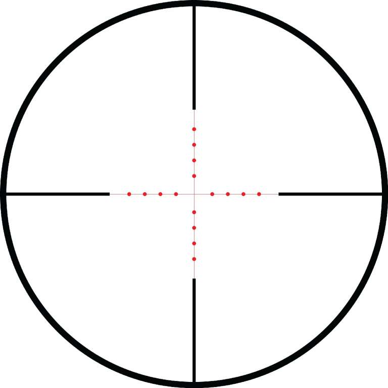 Mil Dot - одна из самых универсальных прицельных сеток, все компоненты этой сетки имеют строго регламентированные размеры, расстояния между всеми элементами также регламентированы. Благодаря этому не проблема определить расстояние до цели, приняв при этом правильную поправку на ветер и определить траекторию полета и падения пули. Данный Mil Dot верен при 10-кратном увеличении. Для других увеличений линейные и угловые размеры определяются методом интерполяции, либо по специальным таблицам. Персональную адаптацию сетки под конкретное оружие и тип снаряда позволит совершить бесплатный баллистический калькулятор.
