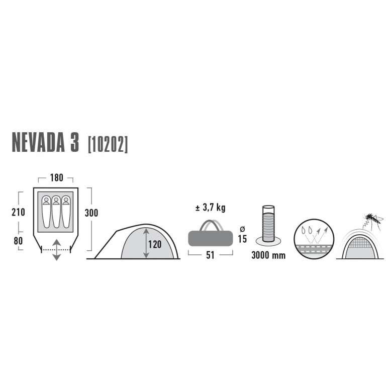 Современная туристическая, двухслойная, 3-х местная палатка High Peak Nevada. Удобный тамбур для вещей, защищенный от непогоды вход с антимоскитной сеткой, система вентиляции "Vario Vent Kontrol", простая установка.