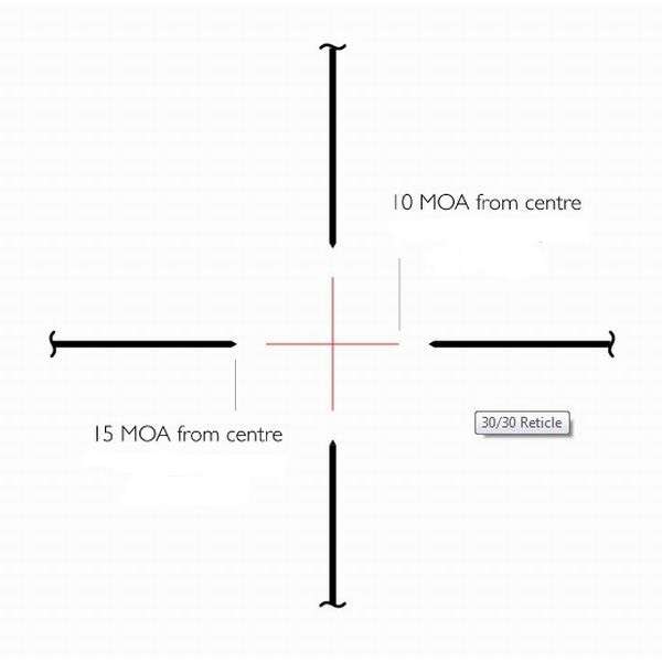 Прицельная сетка 30/30 или Duplex является одной из самых известных, простых и популярных. С ее помощью можно решить сразу несколько задач. Толстые внешние линии легко позволяют "вести" крупную мишень и выстрелить по ней навскидку. Тонкие линии дают возможность точного прицеливания в небольшую мишень. Тонкое перекрестие сетки 30/30 не затеняет цель и не сливается с темным фоном. Расстояние между противоположными тонкими линиями сетки соответствует 30 дюймов на 100 ярдах при увеличении 4х, что также дает возможность приблизительной оценки дистанции до цели. Для другой кратности значения дальности рассчитываются методом интерполяции либо с помощью баллистического калькулятора.