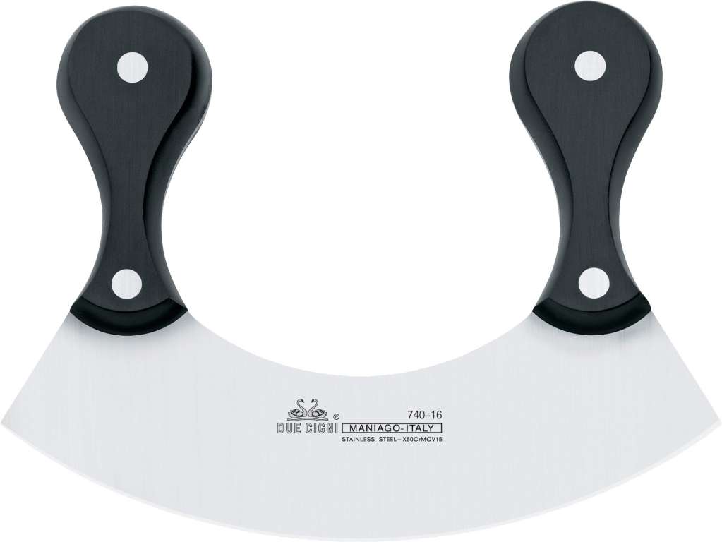 Нож кухонный Due Cigni Shredder Small – профессиональный нож для рубки продуктов с двумя рукоятками. Благодаря своей форме полумесяца он облегчает работу по рубке, идеально распределяя силу и точность. Родиной такой формы является Италия, однако, когда и кем был придуман этот нож – остается загадкой и по сегодняшний день. Клинок данной модели изготавливается из немецкой нержавеющей стали X50Cr15MOV, благодаря которой сохраняет остроту режущей кромки на протяжении длительного периода и не требует особого ухода. Эргономичные рукояти типа full tang, выполненные из полиформальдегида, обеспечивают надежный захват и полный контроль над процессом. Благодаря им топорик не скользит и не проворачивается даже в мокрой руке.Используя Due Cigni Shredder Small, можно молниеносно измельчить зелень, пряные травы, шоколад, орехи в крошку, а хороший кусок мяса превратить в мелкий фарш.
