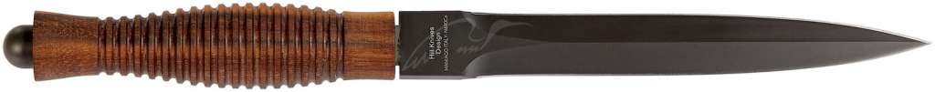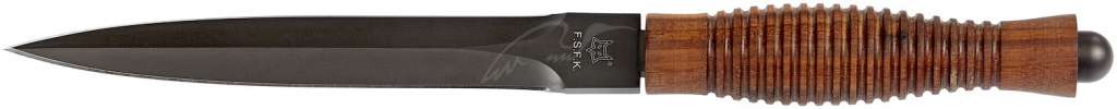 Клинок обоюдоострый, из стали N690Co. Рифление на деревянной рукояти выраженное, с большим шагом. Хвостовик клинка проходит сквозь всю рукоятку и фиксируется съемным навершием с резьбой.