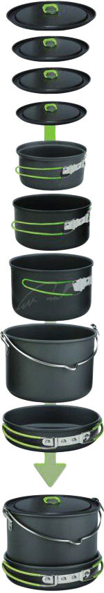 Набор посуды Pinguin Family - рассчитан для приготовления еды на большую компанию или семью из шести человек. Кастрюли изготовлены из анодированного алюминия, а складные ручки сделаны из стальной проволоки с силиконовыми накладками, за которые можно держаться не боясь обжечь руки. Благодаря анодированию, которое создает твердый слой оксида алюминия на внутренней поверхности материала, предотвращается окисление, повышается прочность, устойчивость к царапинам и механическим повреждениям. Купив набор Pinguin Family Вы значительно сэкономите место в рюкзаке. Набор компактно собирается по принципу матрёшки.