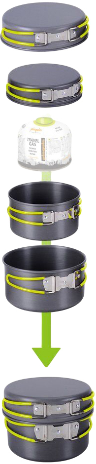 Набор походной посуды Pinguin Quadri Alu - рассчитан для приготовления, разогрева и употребления еды на компанию из четырех человек. Кастрюли изготовлены из анодированного алюминия, а складные ручки сделаны из стальной проволоки с силиконовыми накладками, за которые можно держаться не боясь обжечь руки. Благодаря анодированию, которое создает твердый слой оксида алюминия на внутренней поверхности материала, предотвращается окисление, повышается прочность, устойчивость к царапинам и механическим повреждениям. Купив набор посуды Pinguin Quadri Alu значительно сэкономите место в рюкзаке. Набор компактно собирается по принципу матрёшки.