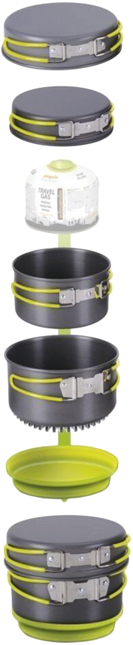 Набор походной посуды Pinguin Quadri Х Alu - рассчитан для приготовления или разогрев еды на компанию из четырех человек. Кастрюли изготовлены из анодированного алюминия, а складные ручки сделаны из стальной проволоки с силиконовыми накладками, за которые можно держаться, не боясь обжечь руки. Глубокая кастрюля снабжена специальным днищем, которое поглощает выделяемое горелкой тепло и равномерно распределяет его по поверхности, это существенно экономит топливо. Благодаря анодированию, которое создает твердый слой оксида алюминия на внутренней поверхности материала, предотвращается окисление, повышается прочность, устойчивость к царапинам и механическим повреждениям. Купив набор посуды Pinguin Quadri Х Alu, Вы значительно сэкономите место в рюкзаке. Набор компактно собирается по принципу матрёшки, внутри кастрюли можно разместить газовый баллон 230 г (не входит в комплект). Так как крышки достаточно глубокие их тоже можно использовать для приготовления пищи.