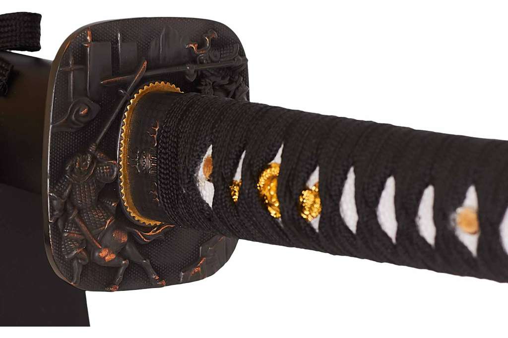 Цуба (гарда меча) имеет четырёхугольную форму (каку-гата) и украшена литьём, изображающим батальную сцену времён Сэнгоку Дзидай («эпохи сражающихся провинций»).