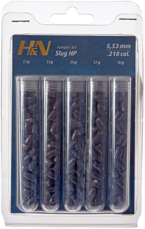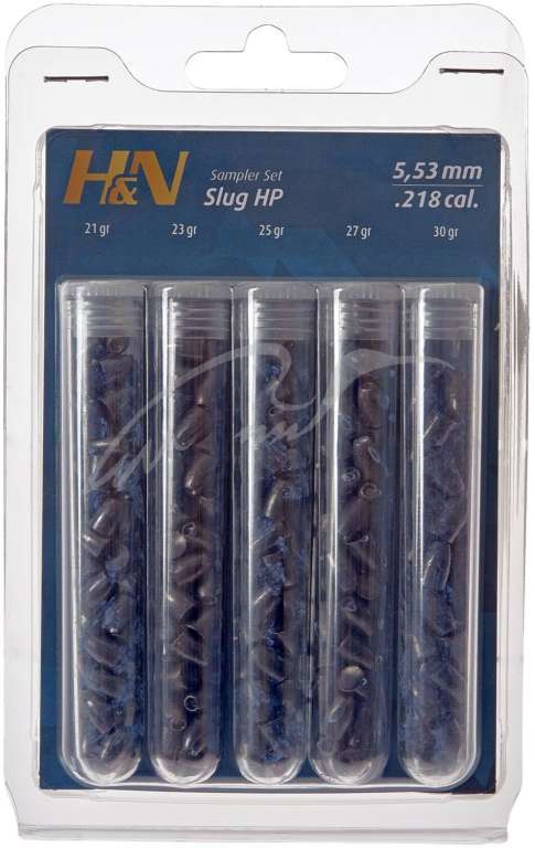 Пули H&N Slug HP Sampler Test Set кал. 5,5 мм используются специально для мощных пневматических винтовок с дульной энергией от 25 Дж.