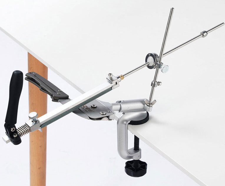 Точильная система Ruixin RX подходит для заточки разных видов ножей и инструментов, благодаря возможности самостоятельно регулировать угол заточки. Система крепится к столешнице при помощи тисков, которые идут в комплекте. Также в комплект входит четыре точильных камня с разной зернистостью (#120,#320,#600,#1500), которые легко заменяются для достижения наилучшего результата.