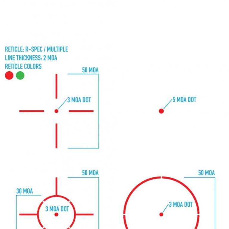 4 типа прицельной марки красного или зеленого цвета (5 МОА точка, 3 МОА точка с 50 МОА кругом, 3 МОА точка с 50 МОА перекрестием, 3 МОА точку с 30 МОА кругом и перекрестием (общие границы 50 МОА)