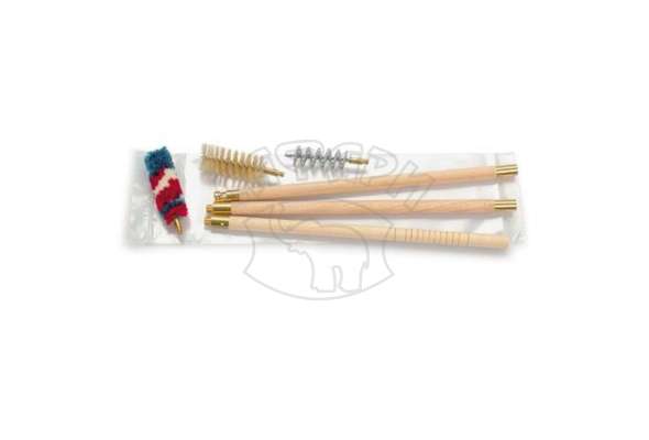 Набор для чистки в полиэтиленовой упаковке, шомпол 3-х секционный в дереве, 3 ерша (Стальной спиральный, щетина, пуховик)