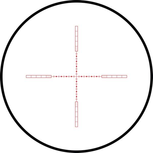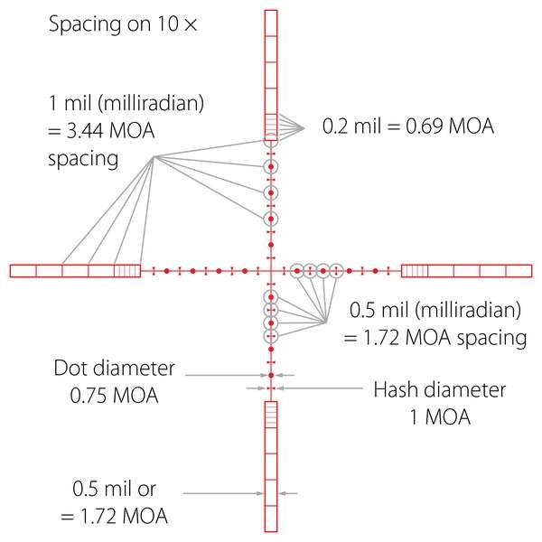 10х 1/2 Mil Dot IR - удобная универсальная сетка для максимально точного прицеливания на различных расстояниях. Главное отличие от обычной прицельной марки Mil Dot состоит в том, что тут имеются дополнительные пересечения, отмечающие пол мила. Все компоненты этой сетки имеют строго регламентированные размеры, расстояния между всеми элементами также регламентированы. Благодаря этому не проблема определить расстояние до цели либо размеры цели, приняв при этом правильную поправку на ветер и определить траекторию падения пули. Данный 1/2 Mil Dot верен при 10-кратном увеличении. Для других увеличений линейные и угловые размеры определяются методом интерполяции, либо по специальным таблицам. Персональную адаптацию сетки под конкретное оружие и тип снаряда позволит совершить бесплатный баллистический калькулятор