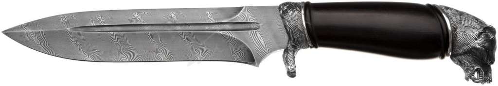 "Медведь" - идеальное воплощение агрессивного охотничьего ножа. Клинок из дамасской стали с узким долом, рукоять черного дерева, прибор из посеребренной бронзы -- такое сочетание не только привлекательно внешне, но и удобно в использовании. Гарда в виде медвежьей лапы, навершие изображает оскаленного, рычащего в ярости медведя.