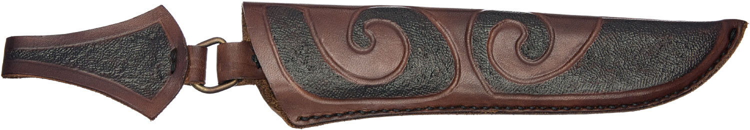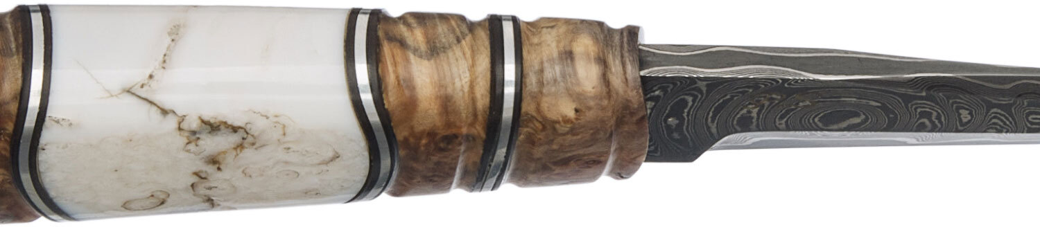 Нож стилизован под классические финские "Puukko". Клинок выкован из дамасской стали, а расцветка рукояти напоминает северное грозовое небо.