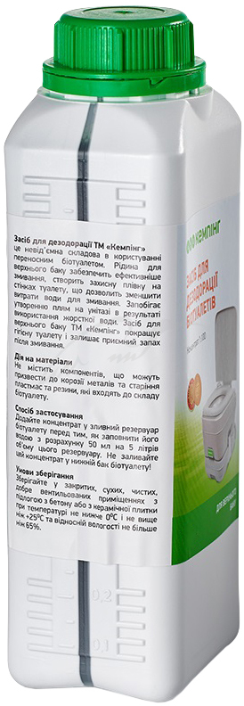 Средство для дезодорации биотуалетов Кемпинг для верхнего бака - специальная жидкость, которая устраняет неприятные запахи и препятствует размножению микробов. Это средство поддерживает чистоту биотуалета, устраняет налет, который может остаться после использования жесткой воды. Также средство для дезодорации биотуалетов Кемпинг устраняет газообразование, которое возникает в процессе разложения отходов. Уменьшает расход воды, при смыве образует микропленку на внутренней поверхности биотуалета, которая очищает и препятствует распространению бактерий и микроорганизмов.