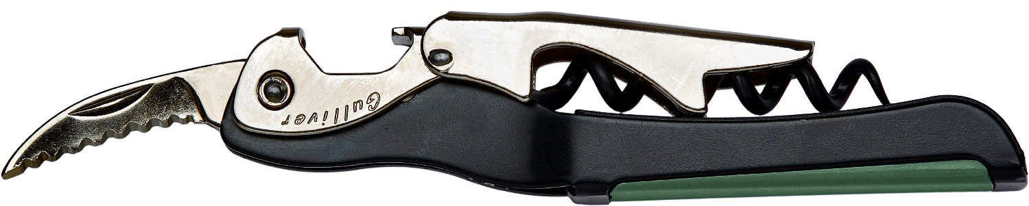 Многофункциональный штопор Gulliver производства компании Due Cigni – это элегантно выполненный и незаменимый инструмент для быстрого, безопасного и комфортного открытия бутылок, запечатанных при помощи деревянных пробок. Кроме непосредственно спирали, штопор имеет малый раскладной нож и двухсегментную открывалку. Профиль штопора в сложенном состоянии напоминает своей формой профиль хищной птицы.