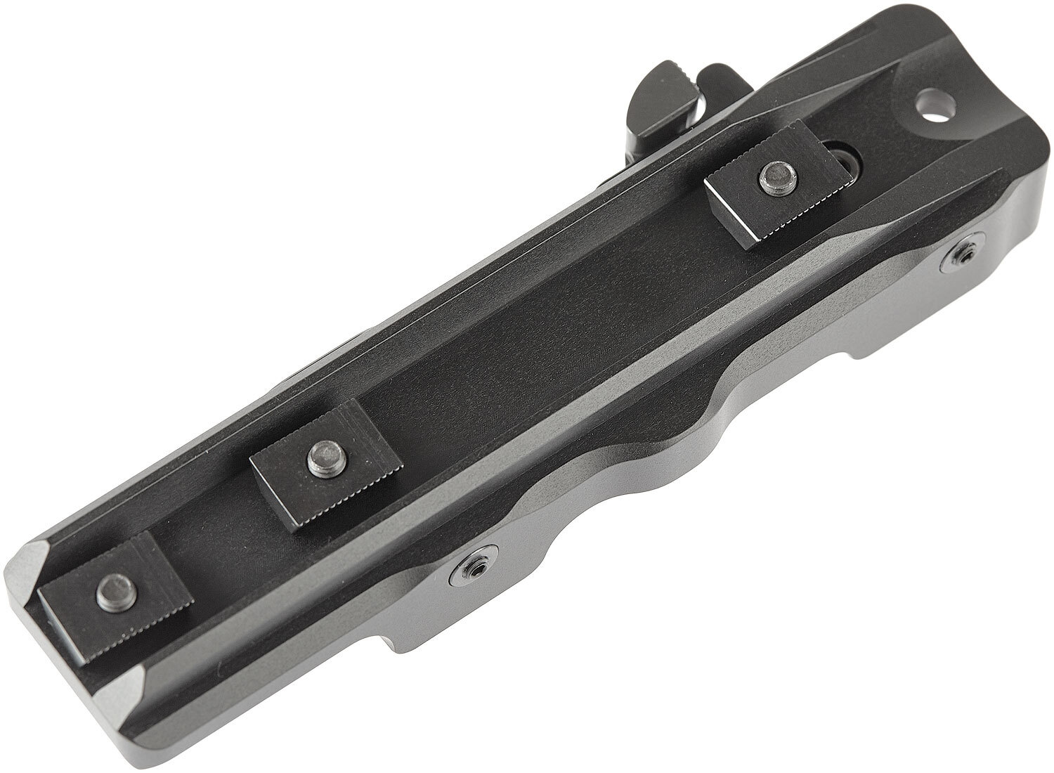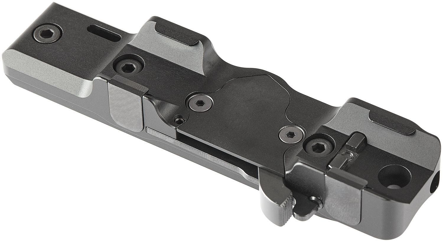 Идеей создания этого крепления была простота и надежность установки. Для установки достаточно отвести центральный рычаг назад, поместить упоры кронштейна в ответные части на винтовке и закрыть рычаг обратно.