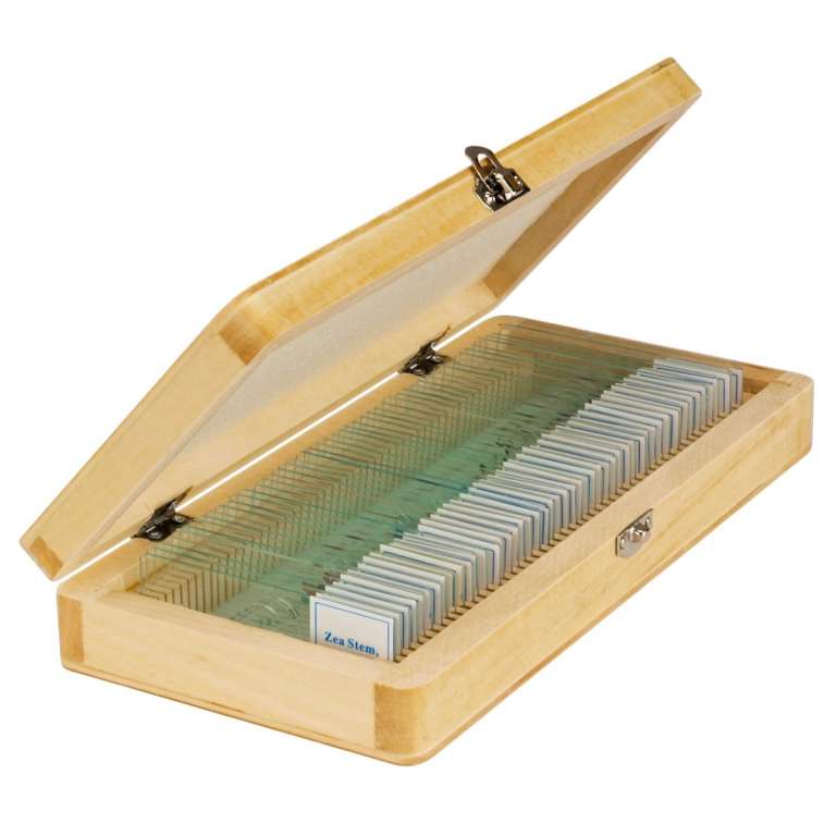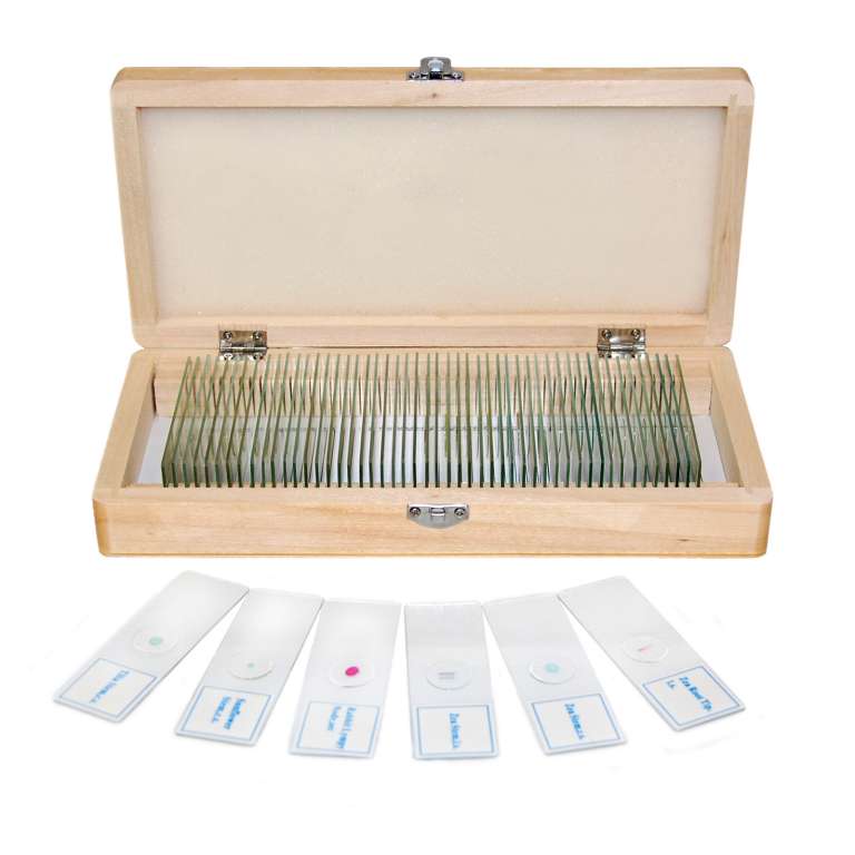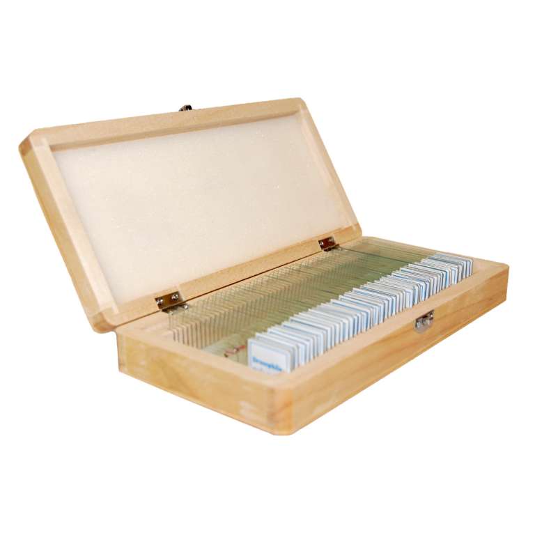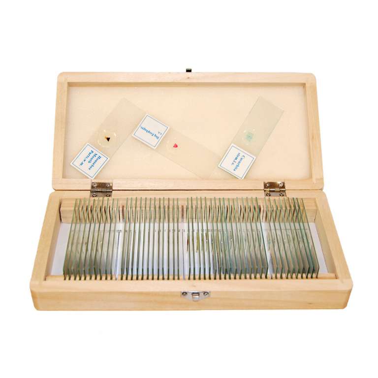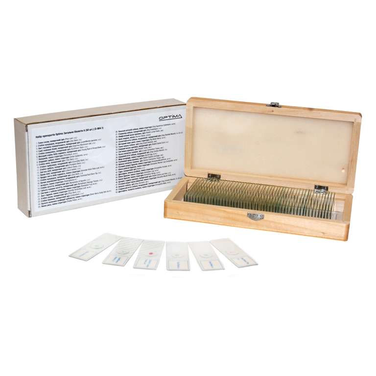 Набор из пятидесяти специально подготовленных образцов (стеклянных слайдов) для исследования под микроскопом. Большинство образцов обработано специальными веществами для повышения контраста. Набор включает как образцы растений и микроорганизмов, так и фрагменты тканей насекомых, животных и человека. Набор является необходимым дедактическим пособием для учителя биологии средних и старших классов, поскольку изучение практически всех образцов лежит в основе школьной программы. Все слайды помещены в деревянный бокс.