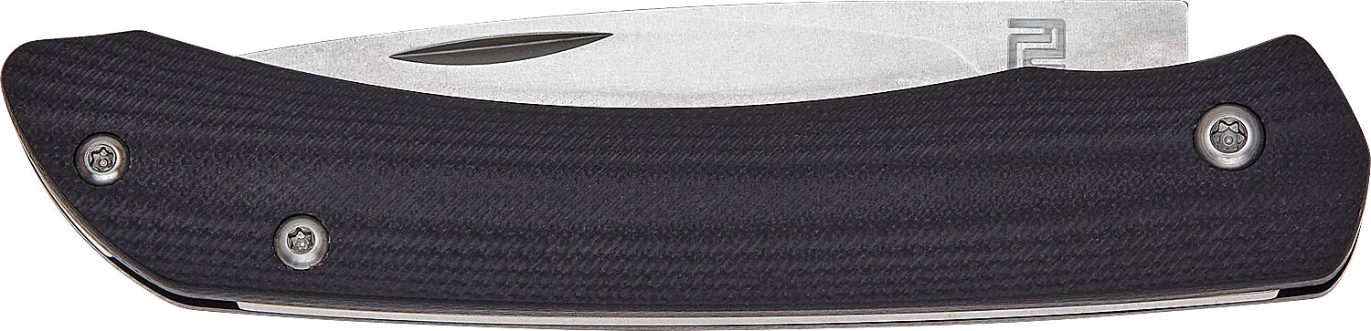 Плавная эргономичная рукоять отлично поместится даже в миниатюрной женской руке. В качестве материалов для изготовления накладок, производитель предлагает выбор между стеклотекстолитом G-10 и углеродным волокном. Также, доступны три цвета накладок из материала G-10: черный, серый и мятный.