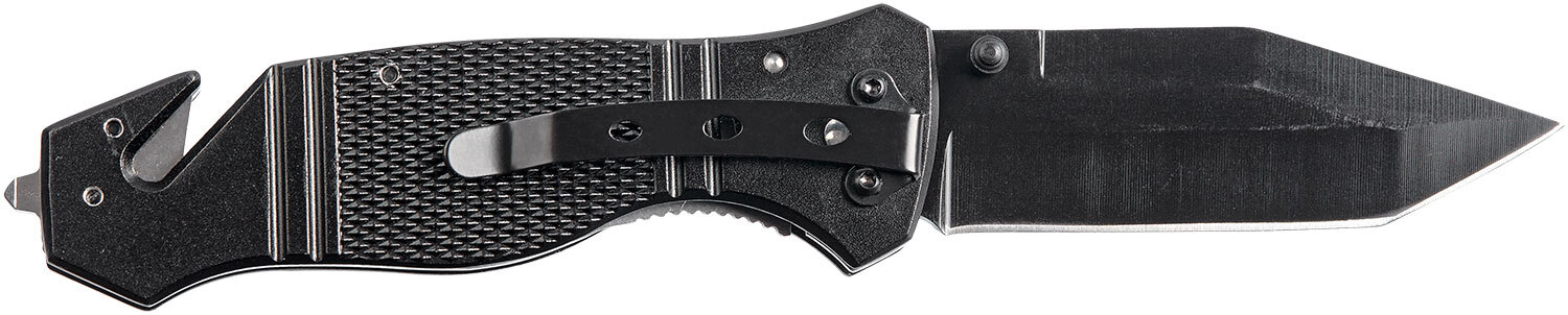 Рукоять выполнена из алюминиевого сплава с цепкой насечкой. Присутствует стеклобой, стропорез, а также стальная клипса для переноски ножа в положении Tip-down.
