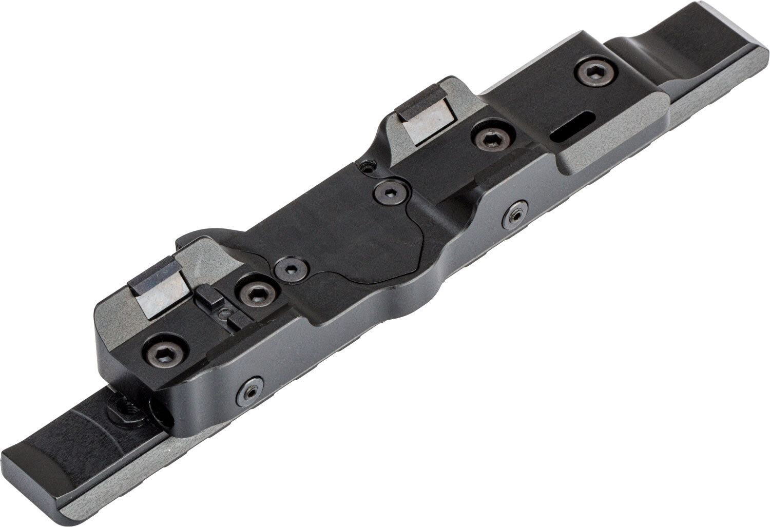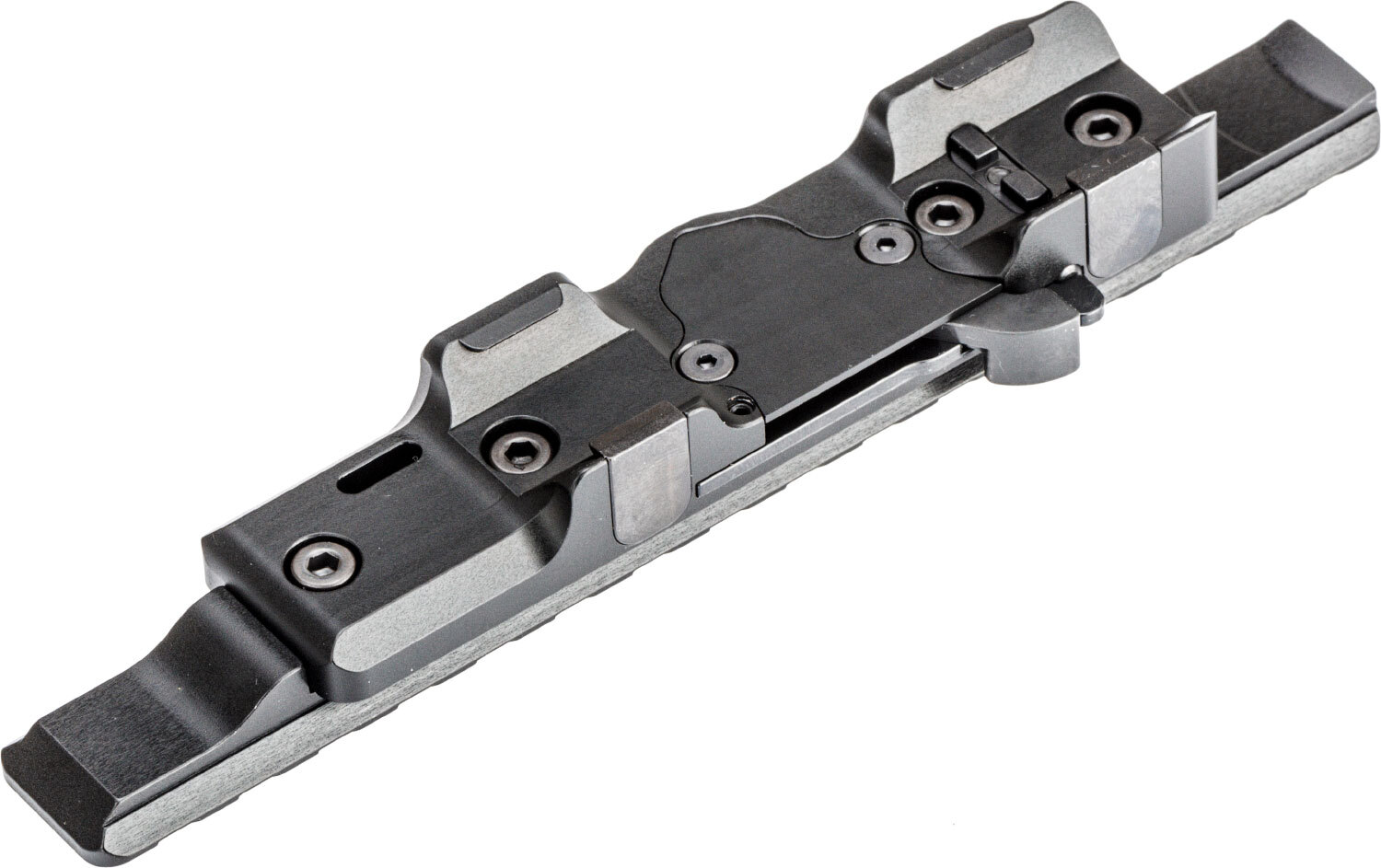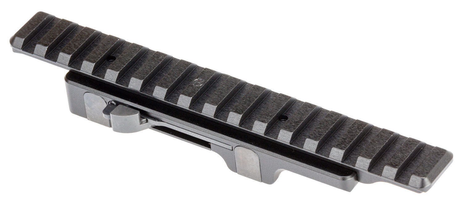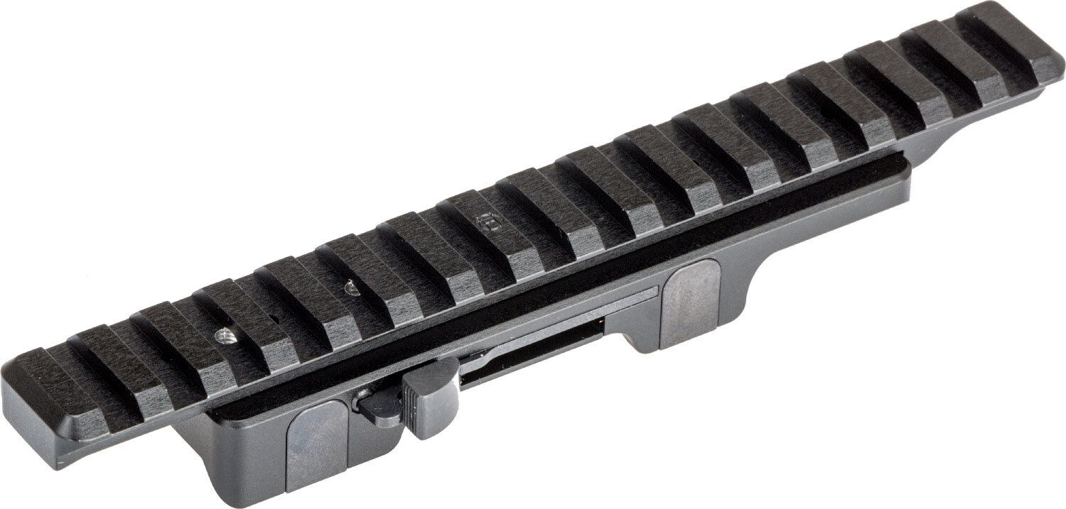 Идеей создания этого крепления была простота и надежность установки. Для установки достаточно отвести центральный рычаг назад, поместить упоры кронштейна в ответные части на винтовке и закрыть рычаг обратно.