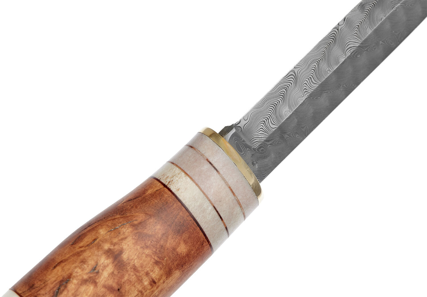 Рукоять выполнена из карельской березы, оленьего рога и тонких полосок из оленьей шкуры. Клинок изготовлен из порошковой нержавеющей дамасской стали (Damasteel®). Тип узора – «северное сияние».
